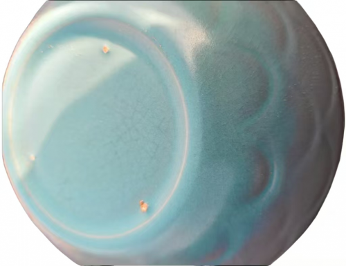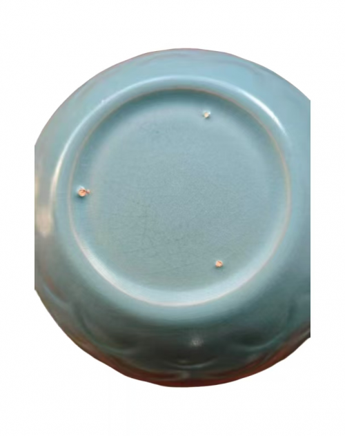 釉面的开片更是天青釉的点睛之笔。这件天青釉(天蓝)莲辫纹汝窑钵的釉面布满细密的蟹爪纹,裂纹深浅交错、形态自然,无刻意规整感,这是釉层与胎体热膨胀系数差异导致的自然开裂,是汝窑的标志性特征。在古人眼中,这种 “残缺” 并非瑕疵,而是 “天人合一” 的体现 —— 自然的力量在釉面留下痕迹,让器物更具生命力与岁月感。部分裂纹内可见岁月浸色,更添古朴沧桑之美,让这件天青釉(天蓝)莲辫纹汝窑钵在温润中多了几分厚重的历史底蕴。 与同时期的其他名窑相比,汝窑天青釉独树一帜:官窑的粉青偏冷,哥窑的粉青偏灰,钧窑的窑变绚烂,而汝窑的天青则是 “淡而有味、雅而不俗”,它褪去了色彩的张扬,以最朴素的色调,传递出最深远的意境,恰好契合了宋代文人 “淡泊明志,宁静致远” 的人生追求。 工艺之精:支钉烧的时代密码 这件天青釉(天蓝)莲辫纹汝窑钵最具辨识度的特征,便是底部的三枚芝麻状支钉痕,这是汝窑典型的裹足支烧工艺痕迹,也是鉴定汝窑系瓷器的核心依据。 裹足支烧是宋代制瓷工艺的巅峰体现。为了实现器物满釉的效果,工匠们会用细小的支钉(通常由瓷土或耐火泥制成)将器物垫起,避免其与匣钵粘连。烧造完成后,敲去支钉,便留下如粟米般大小的钉痕,俗称 “芝麻钉”。这种工艺既保证了釉面的完整与美观,又对工匠的技艺提出了极高要求 —— 支钉的大小、数量、位置都需精准计算,稍有不慎便会导致器物变形或釉面破损。