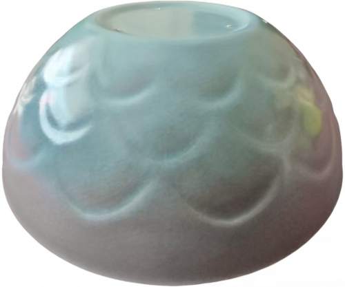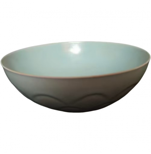 从功能来看,撇口设计既便于握持倾倒,又避免了尖锐棱角的生硬感,让器物在实用中透着温婉;深弧腹造型最大化了容器容积,既适合盛食,也可作茶盏,体现了宋代日用瓷 “实用与审美合一” 的设计理念;矮圈足规整利落,修胎精细,既保证了器物的稳定放置,又在视觉上拉长了腹部曲线,形成 “上轻下重、刚柔并济” 的视觉效果。 与唐代瓷器的丰腴华贵、元代瓷器的粗犷豪放不同,宋瓷追求 “平淡天真” 的意境,这件天青釉(天蓝)莲辫纹汝窑钵正是这种美学的典型代表。它没有繁复的纹饰,没有夸张的造型,仅靠线条的起伏、比例的协调,便营造出一种含蓄内敛、温润典雅的气质。这种极简之美,恰是宋代文人 “外枯而中膏,似淡而实美” 的审美理想在器物上的投射,让器物在实用功能之外,更添了几分文人风骨。 二、釉色之韵:雨过天青的诗意 “雨过天青云破处,者般颜色作将来”,这句传说中周世宗柴荣对汝瓷的赞誉,精准道出了汝窑天青釉的美学精髓。这件天青釉(天蓝)莲辫纹汝窑钵通体施天青釉,釉色呈淡雅的灰蓝色,如雨后初晴的天空,温润内敛,莹润如玉,是宋瓷釉色美学的巅峰之作。 从工艺角度看,汝窑天青釉的烧制堪称古代制瓷的 “炼金术”。釉料中掺入了玛瑙末,这不仅让釉面呈现出独特的乳浊感,更让釉色在不同光线下呈现出微妙的变化 —— 强光下泛着淡蓝光泽,弱光下则透着暖灰调,如云雾般朦胧迷离。这种 “似玉非玉胜似玉” 的质感,正是宋代工匠追求的 “类玉” 境界,他们以瓷为纸,以釉为墨,将自然之美凝于器物之上。